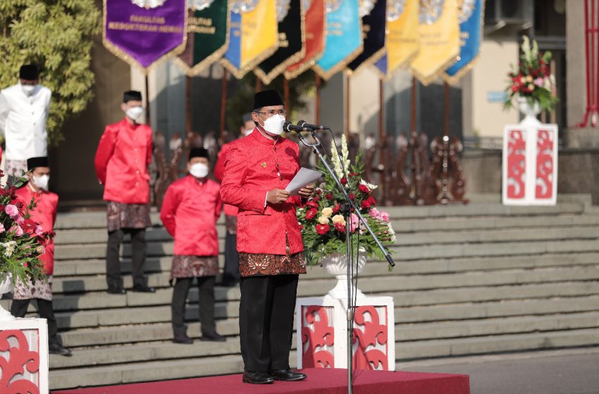 YOGYAKARTA – Pancasila bagi UGM tidak hanya mewarnai dinamika organisasi tetapi menjadi landasan seluruh pemikiran dan tindakan dalam pengembangan kebijakan, program, praktik, dan proses organisasional. Hal itu disampaikan Rektor UGM Prof Ir Panut Mulyono MEng DEng IPU ASEAN Eng dalam upacara Peringatan Hari Lahir Pancasila di Balairung UGM, Selasa 1 Juni 2021.